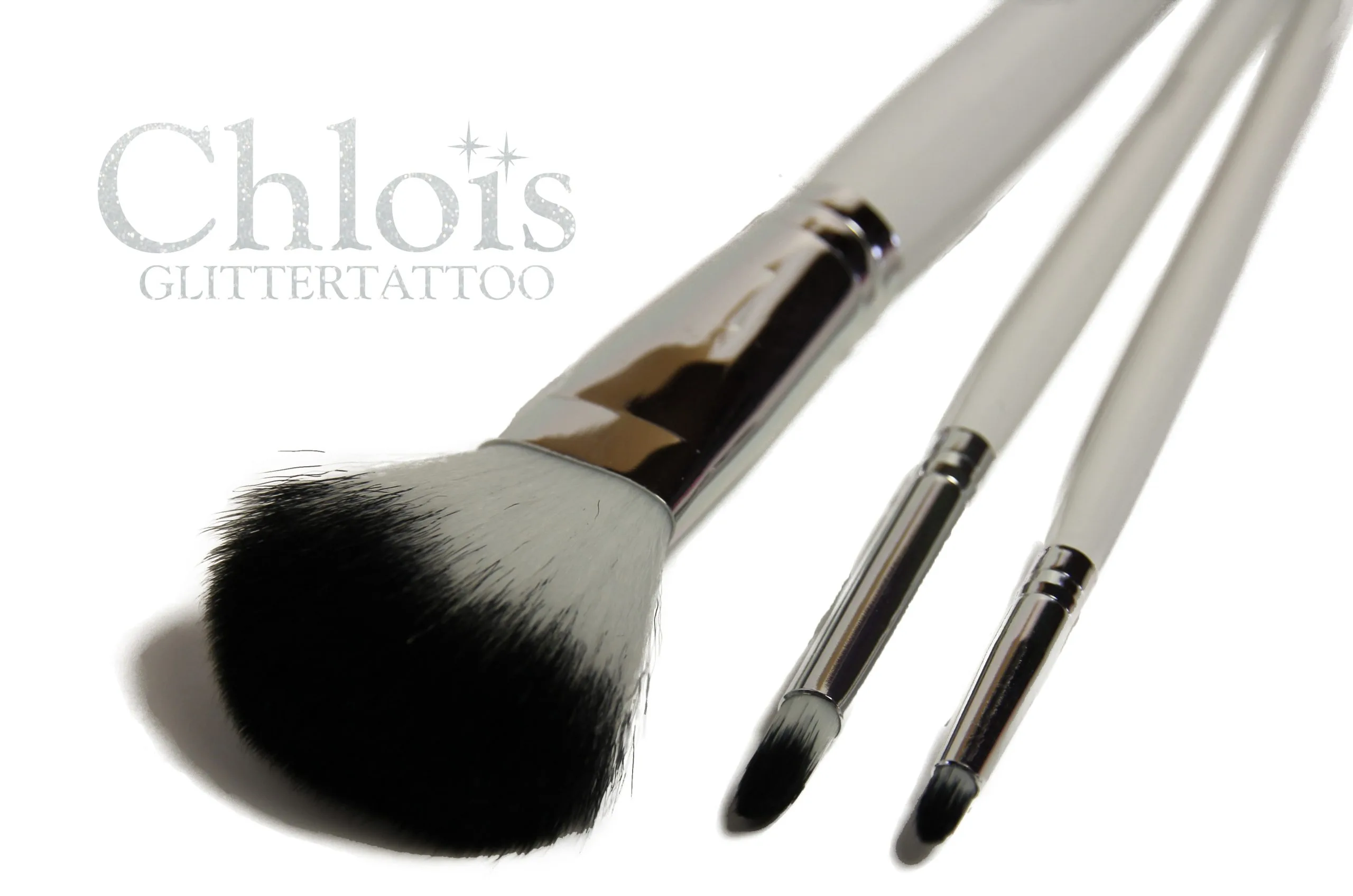 Chloïs Glittertattoo Brushset Pro (3brushes) is de must have als je professioneel met glittertattoos aan de slag gaat. De set bestaat uit twee fijne penselen en een grote kwast. Zonder deze set is het niet mogelijk om de glittertattoo netjes aan te brengen.