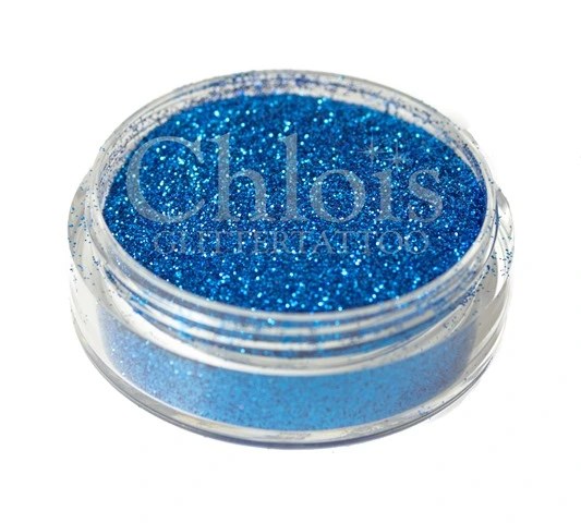 Chloïs Glitter Turquoise 10 ml zijn zwarte schminkglitters voor het maken van glittertattoo’s, maar ook om te verwerken in een schmink ontwerp. bellypaint of bodypaint.