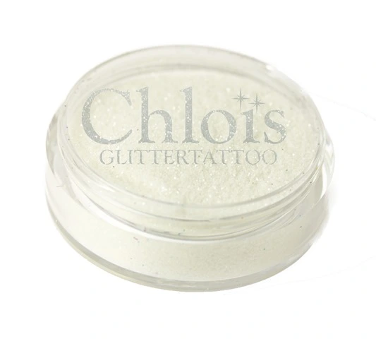 Chloïs Glitter White 10 ml zijn zwarte schminkglitters voor het maken van glittertattoo’s, maar ook om te verwerken in een schmink ontwerp. bellypaint of bodypaint.