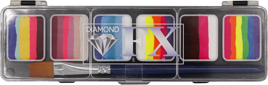 Het Splitcake palette Sparkle is een samengesteld palette met de 6 populairste splitcakes van Diamond FX met zowel essential, neon als metallic kleuren. Het is een handzaam palette waarmee je altijd voor ieder wat wils mee hebt en je de mooiste combinaties kan maken met essential, neon en metallic kleuren. Dit palette bevat de volgende splitcakes: Real Rainbow, Pink Passion, Blueberry Hill, Fabulously Fierce, Evil Rose en Neon Nights. Deze splitcakes bevatten alle type kleuren van Diamond FX, de essential, Neon en metallic colors. De doosjes bevatten 6 gram elk van iedere splitcake.