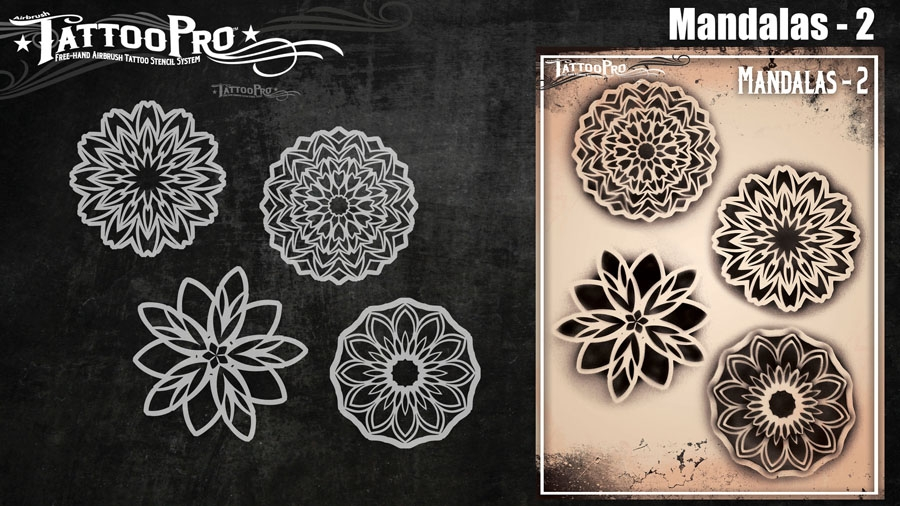 Wiser’s Airbrush TattooPro Stencil – Mandala’s nr. 2zijn Airbrush sjablonen speciaal ontworpen door Bodypaint en Graffiti artist Wiser Oner. Van de sjablonen kun je zowel de positieve als de negatieve delen gebruiken, als je ze uit het vel drukt. Eindeloos te combineren met de andere TattooPro stensils, zodat er iedere keer weer een originele Airbrush Tattoo ontstaat.