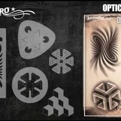 Wiser’s Airbrush TattooPro Stencil – Optical Illusions zijn Airbrush sjablonen speciaal ontworpen door Bodypaint en Graffiti artist Wiser Oner. Van de sjablonen kun je zowel de positieve als de negatieve delen gebruiken, als je ze uit het vel drukt. Eindeloos te combineren met de andere TattooPro stensils, zodat er iedere keer weer een originele Airbrush Tattoo ontstaat.